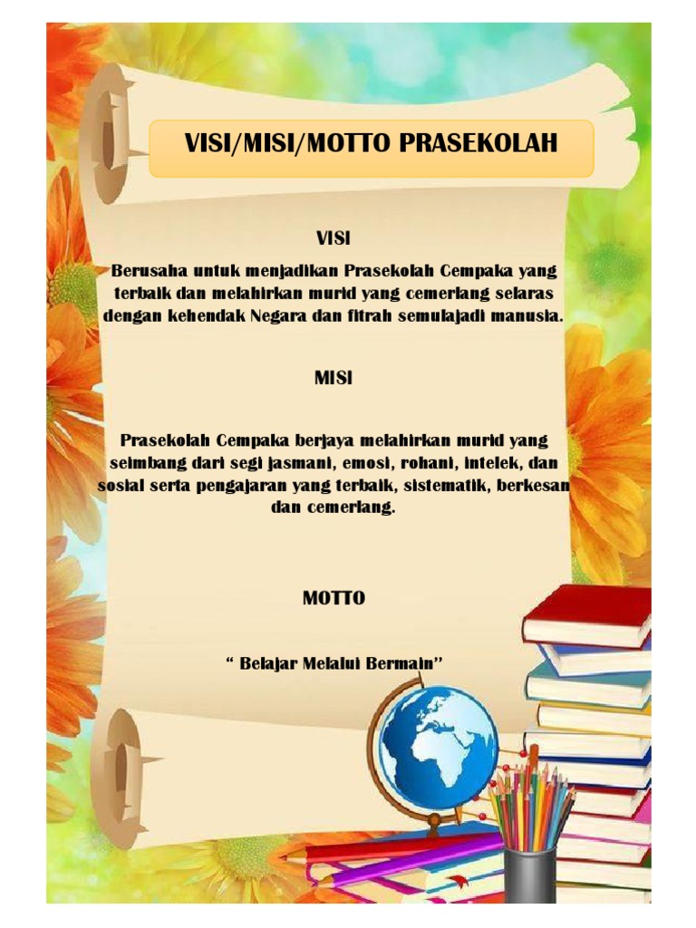 Visi dan misi kami visi. Menyediakan prasarana terbaik dan suasana pembelajaran yang konduksif bagi memenuhi keperluan pendidikan awal kanak-kanak. Kalau rajin pergi open day tanyakan atau pay attention pada visi dan misi tadika tu.